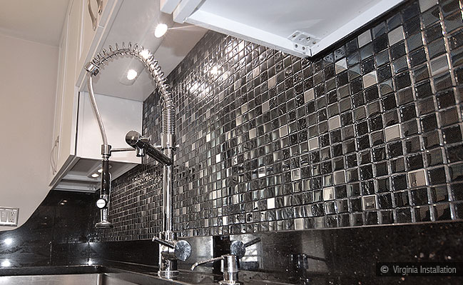 Glass backsplash with galaxy countertop and white cabinets Published April 10, 2014 at 649 × 399 in Budget-Friendly Small Kitchen Backsplash Ideas Glass mosaic style backsplash Such a nice contrast , such a nice design ← Previous Next →